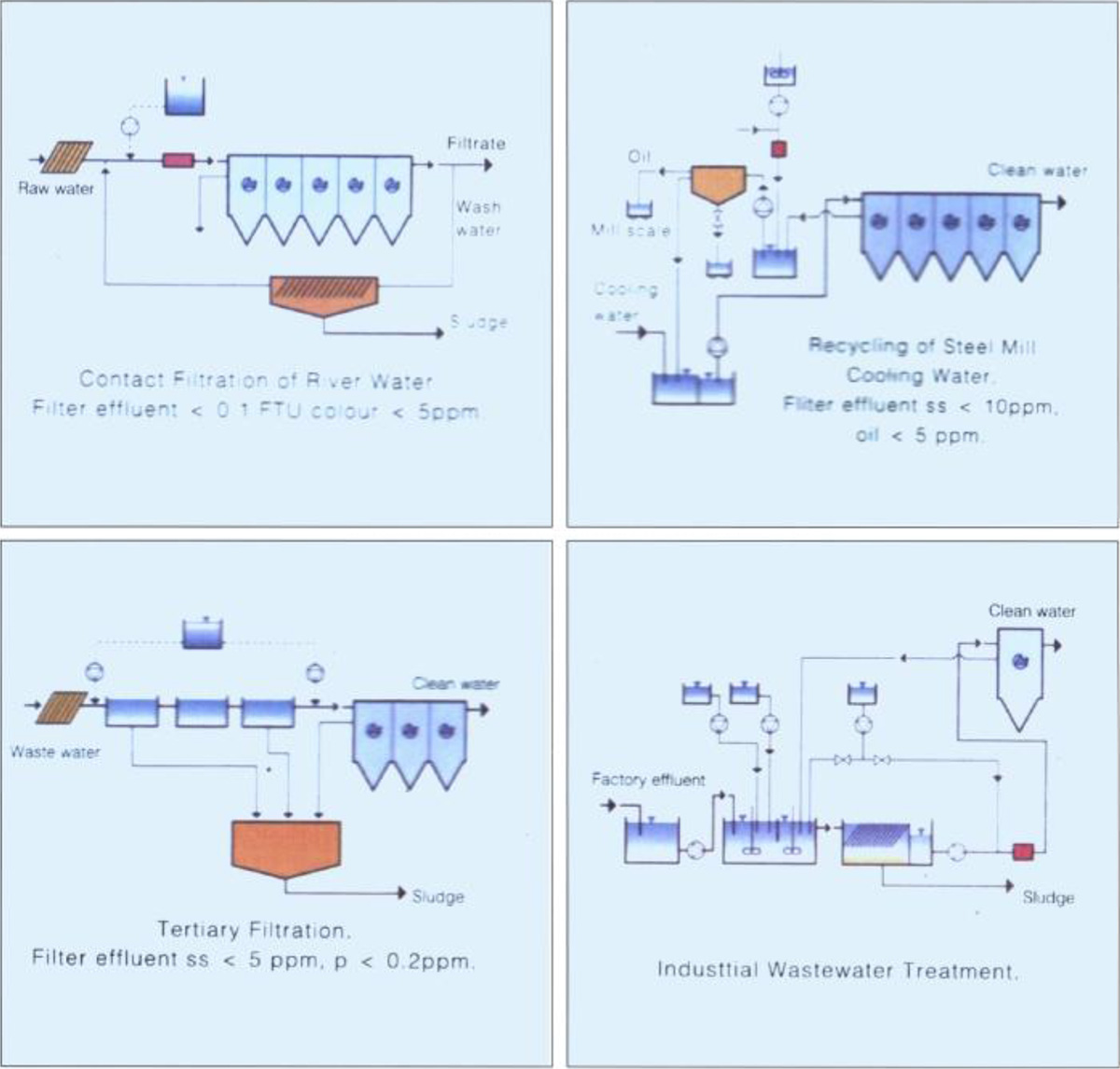 連續(xù)接觸式過濾用于將河和湖水生產(chǎn)成工業(yè)用水或飲用水,也用于廢水處理:絮凝化學(xué)藥品被添加到連續(xù)流砂過濾器進(jìn)水,濾床前部作為反應(yīng)介質(zhì)為絮凝物快速形成提供了好的條件,無需絮凝池。而且因為連續(xù)流砂過濾器具備處理高濃度懸浮固體的能力,所以污水不需要預(yù)沉降。